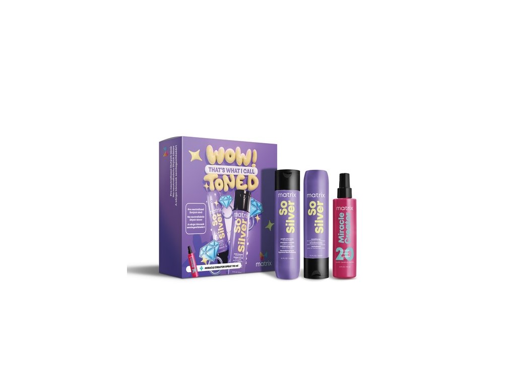 Balíček obsahuje: Matrix So Silver šampon 300ml + Matrix So Silver balzám 300ml + Matrix Miracle Creator sprej 190ml